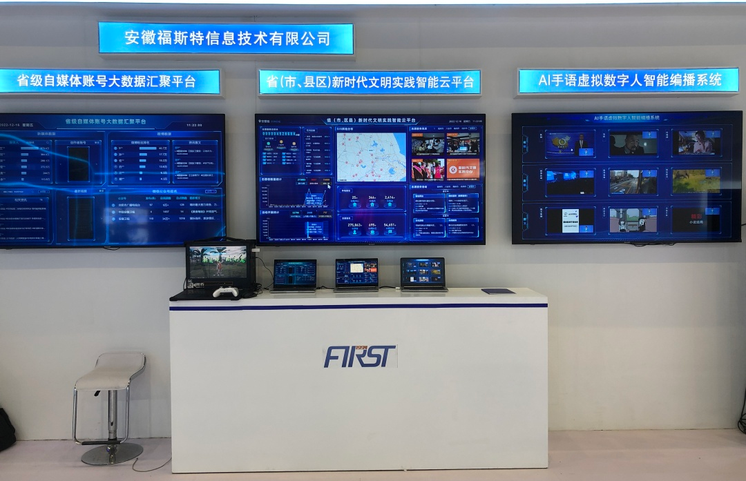 安徽福斯特信息技術有限公司此次應邀參展,以廣電媒體發展為亮點,集中展示大數據、人工智能,呈現了AI-VLOG視頻智能合成系統+AI手語虛擬數字人智能編播系統+省級自媒體賬號大數據匯聚平臺+省(市、縣區)新時代文明實踐智能云平臺技術。